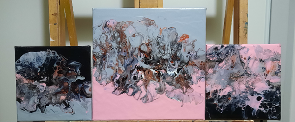 LOT DE 3 Tableaux "Pouring" LE TRIO , N° 1, 20x20 CM- N° 2, 30 x 30 cm - N°3, 20x20 CM